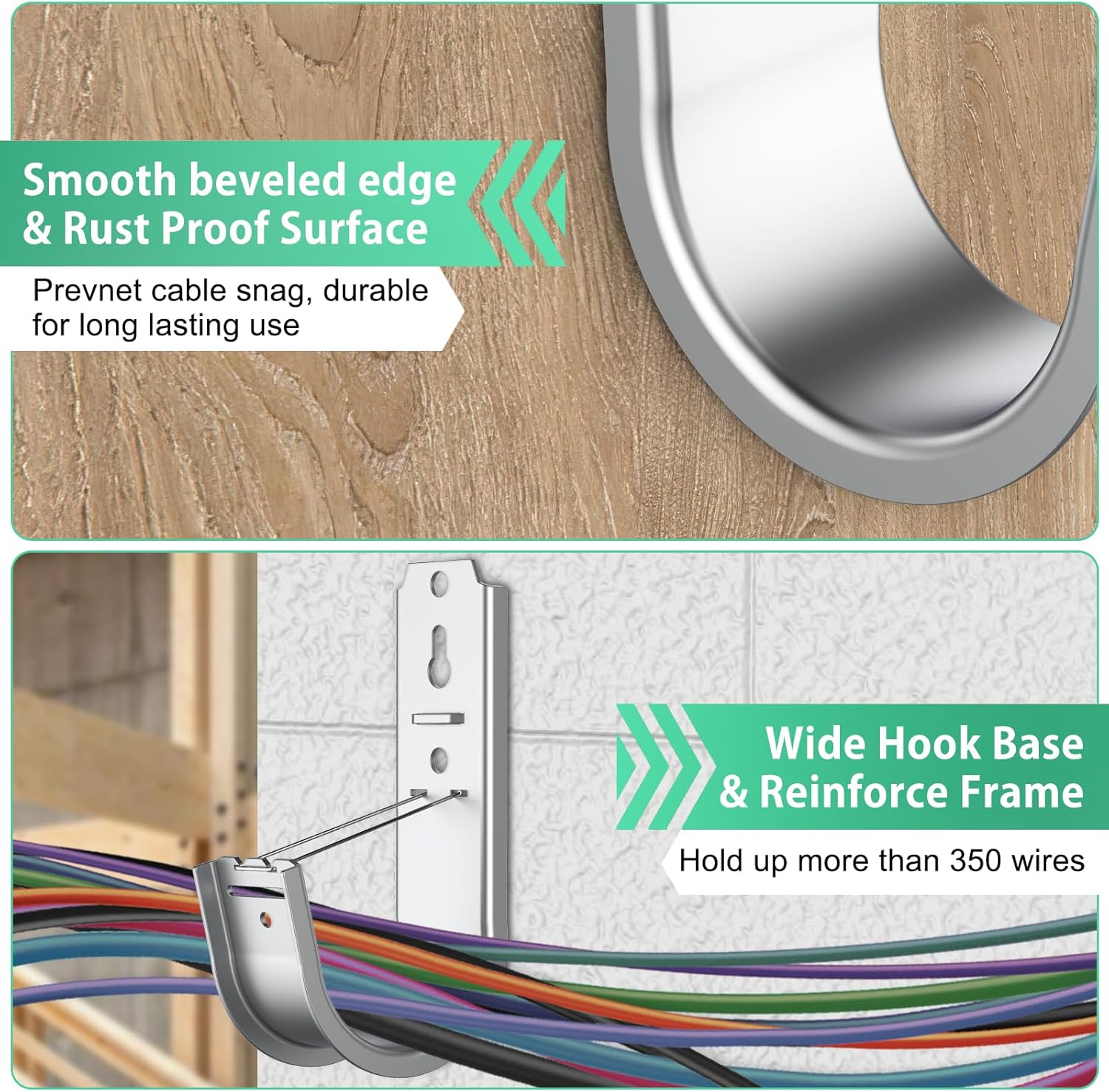 Function: IRENPORU 2 inch J Hook is designed to provide a solution for building cable organization by securing cables along wooden frame struction, wall. Suitable for many types of cable to use, such as fiber optic cables, data, and power cables. Ensure your cable installation neat and secureHigh Quality: Our wall mount J hook is made of premium galvanized steel, which has excellent rust-free performance; Sturdy structure design, each J hook supports up to 80lbs, not easy to deform, Durable for long-lasting useSecure Retainer Clip & Smooth Round Edge Design: The retainer clip designed to prevent cable slippage from the J hook, to provide a tidy cable management guarantee; Smooth, rounded edge design to protect the cable from damage, reduce the risk of wire damageWidely Usage: The Cable J Hook for Hanging accommodates CAT5e, CAT6, CAT6a, coax fiber, and conduit many types of cable to use; Suitable for commercial and residential building, data center, the location requiring cable managementPackage Include & Quality Guarantee: 100 Pack Wire Hook for Cable Management with Retainer Clips; If you have any quality problem, please feel free to contact us, After receiving your feedback, we will give you satisify solution