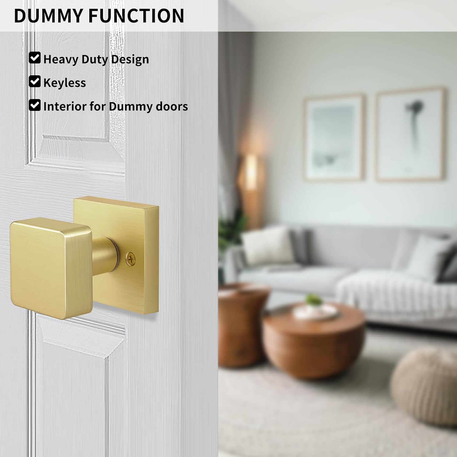 2 Pack Gold Dummy Door Knob, Brushed Gold Door Knobs Interior for Closet, Heavy Duty Square Satin Brass Door Knob Modern Dummy Door Handle