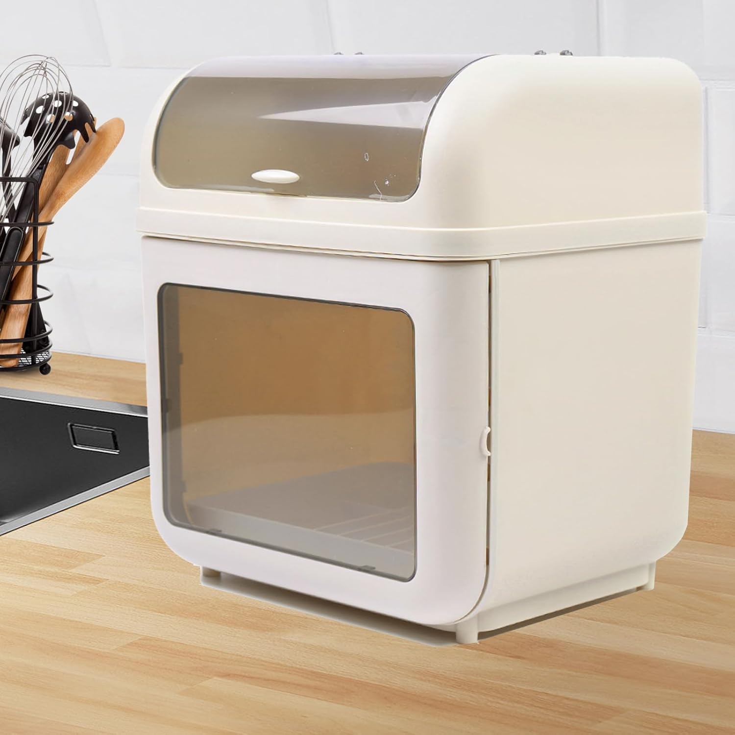 Product Description SpecificationMaterial: PPColor: White, Semi-clear GreyAssembly Required: YesMount Type: CountertopNumber of Tiers: 2Product Size: 37.8*28.3*44.3cm/14.88*11.14*17.44inNet Weight: 2.3kg/5.07lbsKey FeaturesStorage Assistant: The upper tier can hold plates, knives, forks, chopsticks (all are not included), etc. The lower tier can accommodate bowls, cups, and other tableware (all are not included), making full use of vertical space and allowing you to store them in tiers, creating a clean and orderly kitchen for you.Easy to Access: The upper 90° flip design, the lower 105° magnetic suction large door, and comfortable round handle make it easy for you to access tableware, even with one hand.Space-saving: Its compact size (15.35*11.42*11.42in) is convenient for you to use or suitable for your cabinet height. It can free up kitchen counter space, creating a neat and clean kitchen.Effortless Installation: The simple structure and complete accessories allow you to quickly complete the installation without the help of others.Ideal Gift: This practical product will be a wonderful surprise for your family or friends, bringing them a more convenient life.Buy with Confidence: We are honored that you have chosen our product. We have sufficient confidence in the quality of the product so that you can buy it confidently. But if you have any questions, you can contact our customer service, he will patiently answer and solve your problems.Clear Dust Cover: It will protect washed tableware from the contact of flies, mosquitoes, cockroaches, dust, and more. Drip Tray: It allows for quick water separation and its pull-out design makes it easy to clean it.Package Included1* Dish Drying RackAll Accessories for Assembly