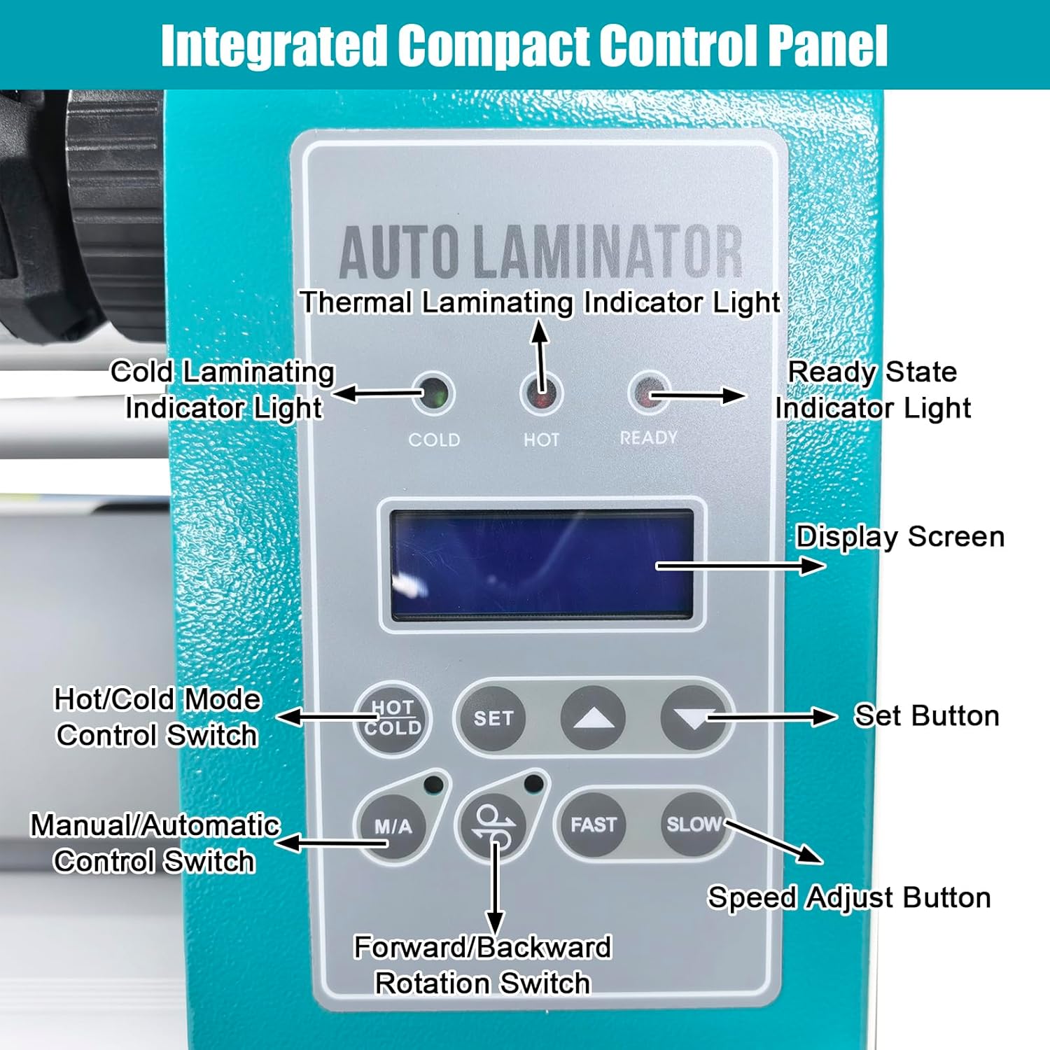 Parameters: Product Name: Full Automatic Pneumatic Laminating Machine Max. Laminating Width: 63In (1600mm) Max. Laminating Thickness: 1.38In (35mm) Max. Laminating Speed: 10m/min Temperature Adjusting Range: 0 to 60℃/140℉ Material of Rollers: Silicone material of Rubber Roller Roller Lifting Way: Air cylinder Roller Heating Type: Within the Infrared Heating Preheating Time: 5-10min Running Method: Automatic/Manual (Foot Pedal) Net Weight: 146kg (321.84LB) Whole Size: about 77.95''x22.83''x53.54'' (198x58x136cm) Four Universal Casters with two Brake Foot Switch and Emergency Stop Button Note: Air compressor NOT included, the air compressor should prepared by yourself. Package included: (120106) 1set 110V 64" Full Automatic Pneumatic Laminating Machine Single-sided Roll Laminator(air compressor not included) Features: 1. Compact Control Panel: An intuitive control panel with a digital display allows for easy mode switching, parameter adjustment, and speed control, improving both operation and efficiency. 2. Organized Back Panel: The rear panel consolidates the power switch, connectors, and fuse holders for easy setup and maintenance, simplifying power and accessory management. 3. Adjustable Film Stripping Rod: The film stripping rod features two storage positions: a low position for use and a high position for storage. 4. Secure Support Rods: The support rods have adjustable tensioning knobs for easy installation and reliable fixation. 5. Integrated Cutting System: Four adjustable cutter sets are included, allowing for quick and accurate trimming of white edges after lamination. 6. Real-Time Pressure Gauge: An air pressure gauge provides a clear, real-time display to prevent over or under-pressure. 7. Dual-Function Foot Pedal: A innovative foot pedal controls both the roller movement and machine operation.