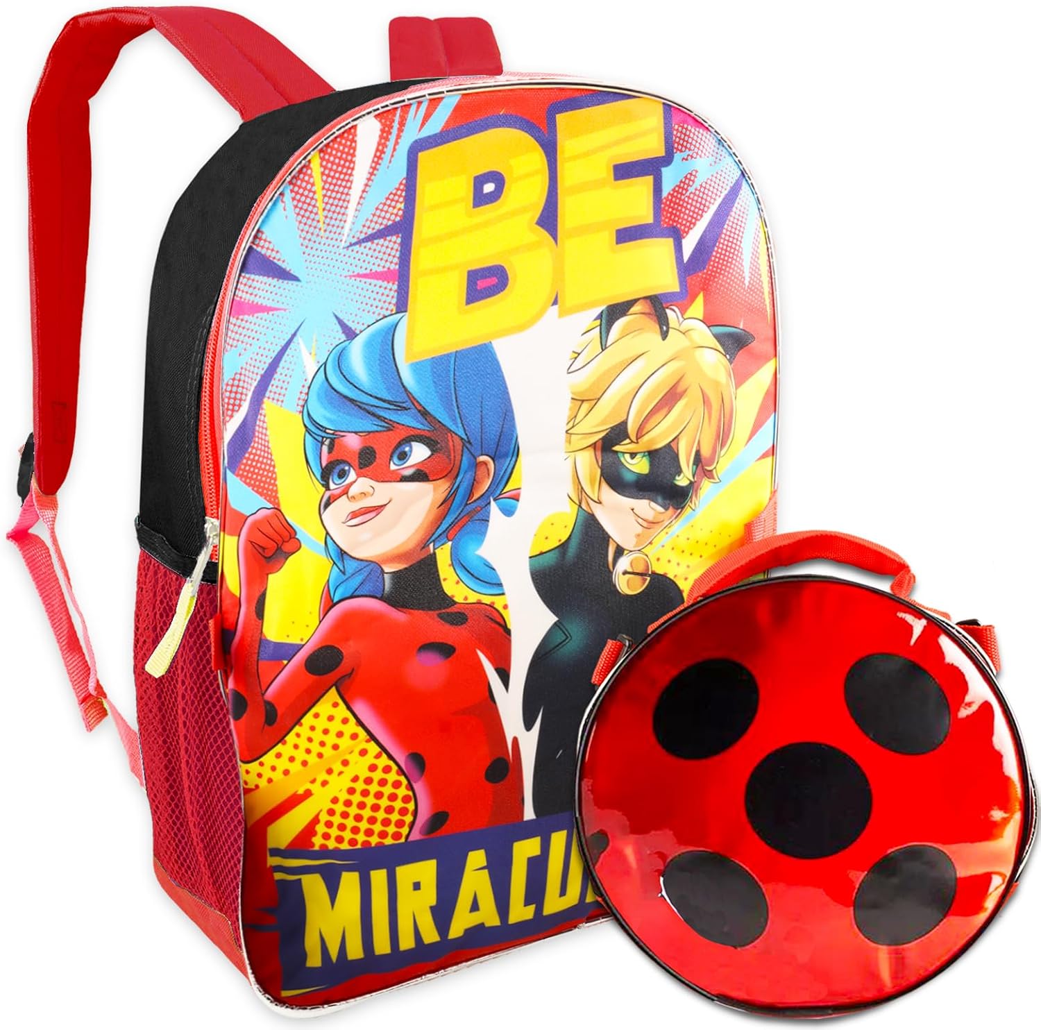 Miraculous Ladybug Backpack and Lunch Box School Set - Bundle with 16" Miraculous Ladybug Backpack, Insulated Lunch Bag, Water Bottle, and More (Miraculous Ladybug School Supplies). This Miraculous Ladybug set includes one 16" backpack and one insulated lunch bag, each featuring artwork of Miraculous Ladybug characters. This set also includes a bonus Beach Kids water bottle. Show off your love of Miraculous Ladybug in style! This backpack is sure to be a hit with Miraculous Ladybug fans of all ages and pairs perfectly with all other Miraculous Ladybug merchandise. This Miraculous Ladybug insulated lunch box is sure to keep your food at the perfect temperature for hours and is great to take to school, the beach, on a picnic, and anywhere else! Officially licensed Miraculous Ladybug backpack and lunch bag set for kids of all ages, boys and girls alike, also includes Miraculous Ladybug stickers, and a Beach Kids door hanger.
