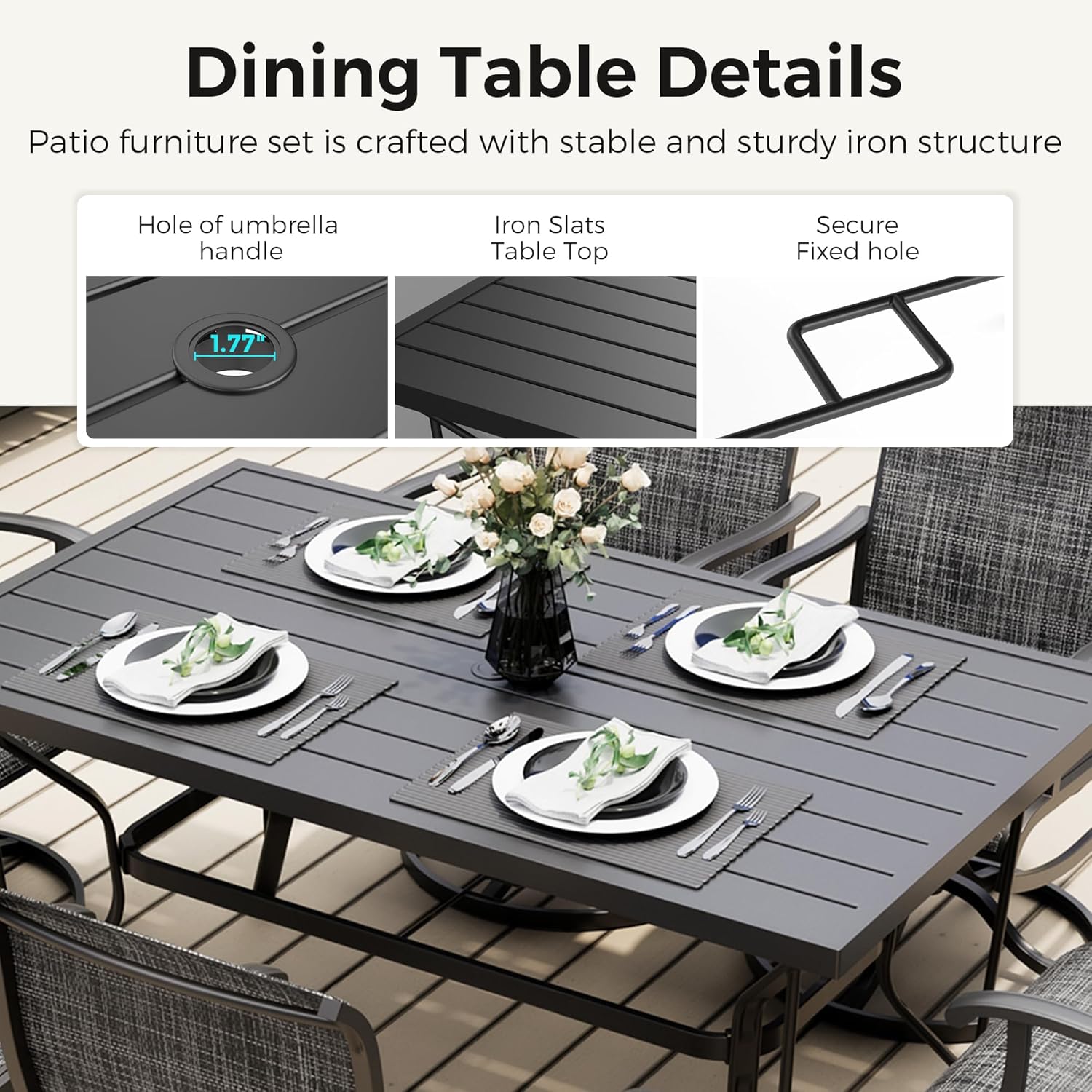 • ●【IRON SLATS TABLE TOP】 The new iron slats table top makes the dining table more durable, dirt-resistant and easy to clean. The hole allows you to add a parasol for shade. And the legs of the table have adjustable legs to ensure the stability of the table.