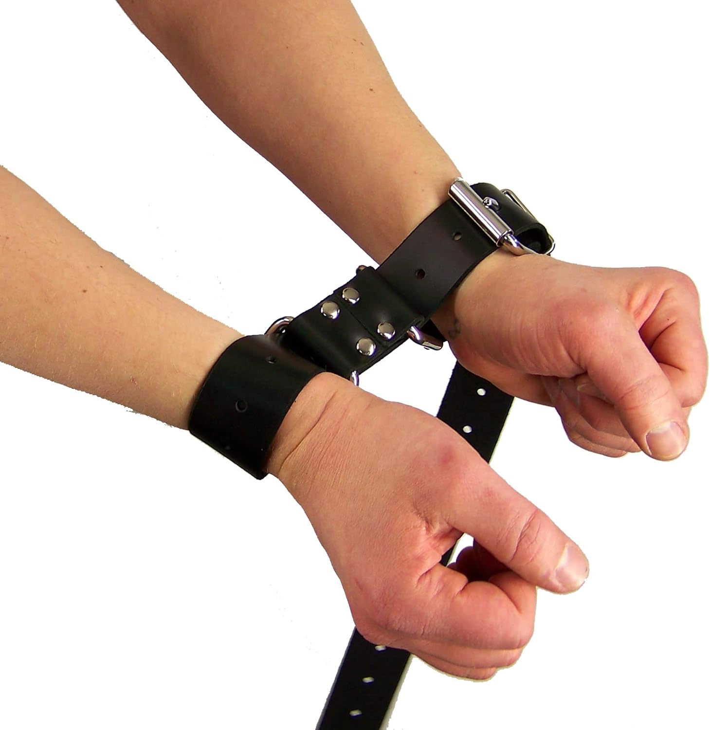 What a great idea! A belt you can wear and take off anytime to tie up your favorite person! Built to last a lifetime of use and abuse. 1 1/2" wide premium black latigo leather, stainless steel hardware. Great everyday belt. Available in three sizes. Small 29"-34" Medium 34"-40" Large 40"-46" *Small overall actual length of belt is 41", Medium overall actual length of belt is 47", Large overall actual length of belt is 53" **These belts have 1" spaced holes throughout the entire belt allowing them to be sized down to wrist size for bondage use. Handmade in the USA.