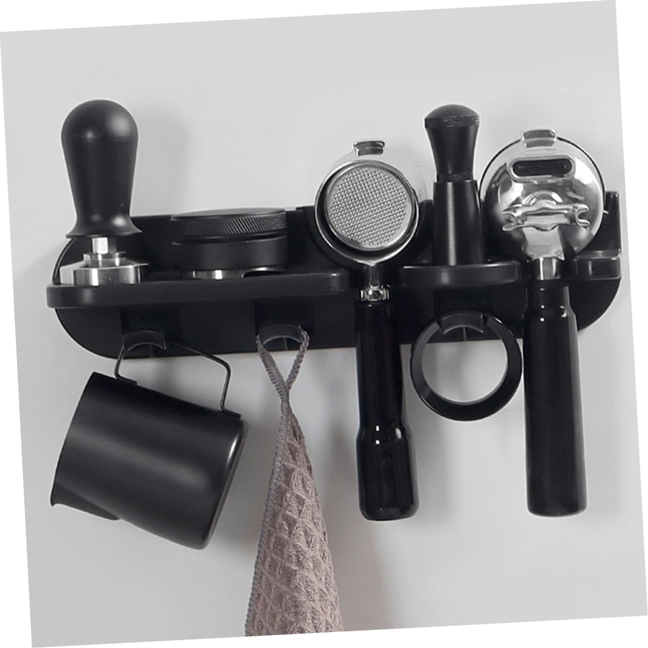 Package List 1 x storage rack 1 x adhesive backing 2 x coffee machine storage rack Features -Material:Abs -Size:32.00X10.00X8.00cm/12.58X3.93X3.14in -Color:Black -Featuring a dedicated space for handle, cloth, and tamper, this rack you have all the tools needed for superior coffee preparationGoods InformationCrafted from ABS with sleek black finish, this coffee machine accessories storage rack transforms your coffee station by neatly organizing essential tools like portafilters, tampers, and powder cloths. Its wall-mounted, self-adhesive design eliminates the need for drilling, protecting your walls from damage and making installation quick and renter-friendly. Sized to fit 51mm espresso machines, it secures your equipment closely, streamlining your workflow. From kitchens to office break rooms and coffee shops, this organizer helps maintain a tidy environment that elevates your coffee-making experience. By keeping your espresso accessories accessible and orderly, it supports a clutter-free counter and visually appealing setup. This storage solution enhances everyday coffee rituals, making preparation more efficient and enjoyable while complementing modern kitchen aesthetics From PRETYZOOM was founded to bring practical and stylish storage solutions to coffee lovers who appreciate organized spaces. Rooted in craftsmanship and innovation, our products like this coffee machine storage rack enhance daily routines by combining convenience with sleek design. Enjoy a more enjoyable coffee experience with PRETYZOOM, where every detail supports your passion for great coffee