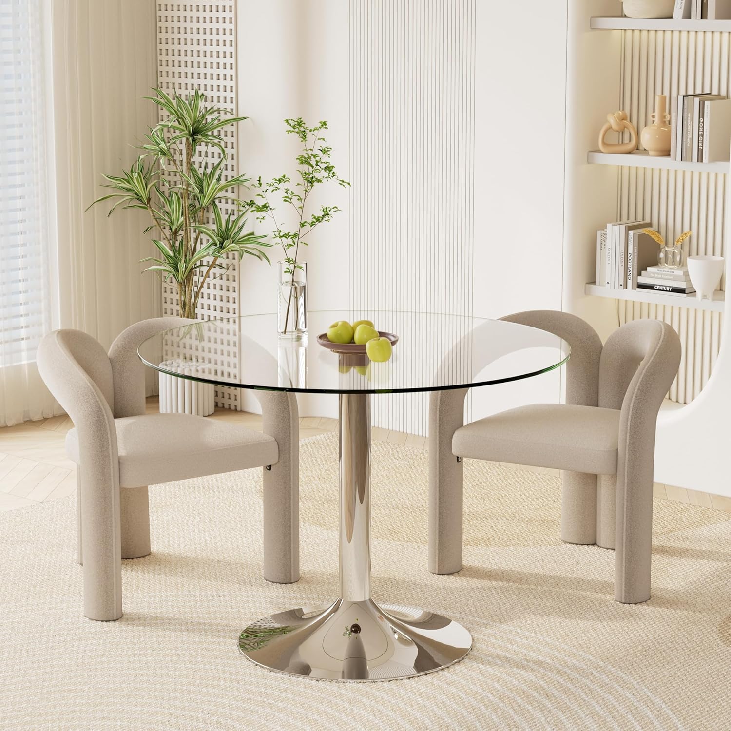 HAIZAO This modern suit suitable for all occasions, whether it is a restaurant, living room, kitchen, balcony or outdoor patio dinner, this suit can bring you ideal use and increase the elegant and charming atmosphere.Product DetailsProduct Included: 1 Table + 2 Chairs Table Color: Clear Glass Top + Silver Legs / Black LegsChairs Color: Beige / Black / Blue / Avocado Green / Grey Table Details: Glass Round Dining Table for 2 - 4, Kitchen & Tulip Dining Room Tables, Modern Circle Dining Room, Glass Tabletop with Metal LegModern Minimalist Dining Table35'' Table Dimension: 35.00''D x 35.00''W x 29.5''HThis dining table with glass table top and plated metal base design. It has a sleek and simple design, which could be suitable for all decor design. The strong metal legs can withstand 300 pounds, which is safe and durable.Comfortable Accent ChairsDimension: 19.88''D x 25.2''W x 27.95''HThis modern barrel dining chair is made of premium velvet, which is soft and durable. The solid metal leg support the long term use, can withstand 250 pounds, which is safe and durable. Besides, the non-slip feet can ensure safety when used. This stylish chair can be used as a dining chair, a cosmetic chair and so on.