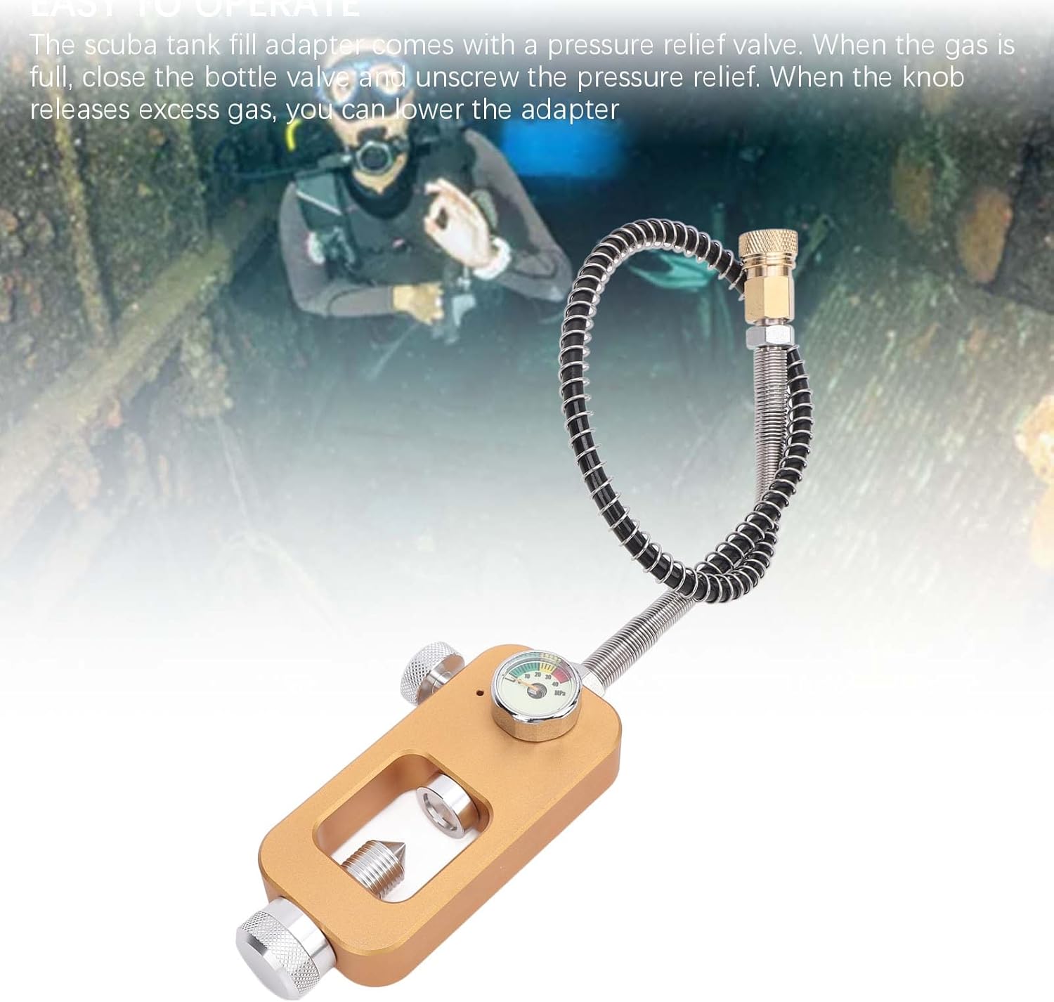 Product Description:This scuba tank adapter is designed for convenient scuba tank refilling, allowing you to easily transfer air from a large tank to a smaller one. Featuring a 40MPa pressure , an 8mm inflatable interface, and a secure locking mechanism, this scuba tank fill adapter ensures a safe and efficient air transfer process. Made from Sturdy aviation aluminum, it is lightweight and portable, making it an essential diving accessory for easy air refills.Specifications:Item Type: Scuba Tank AdapterMaterial: Aviation aluminum, metal, rubberInterface Female Thread Size: M18x1.5Total Length: Approx. 64cm / 25.2inInflatable Interface: Approx. 8mm / 0.31inPackage List:1 x Scuba Tank AdapterNote:Please allow tiny size error due to manual measurement. Thanks for your understanding.