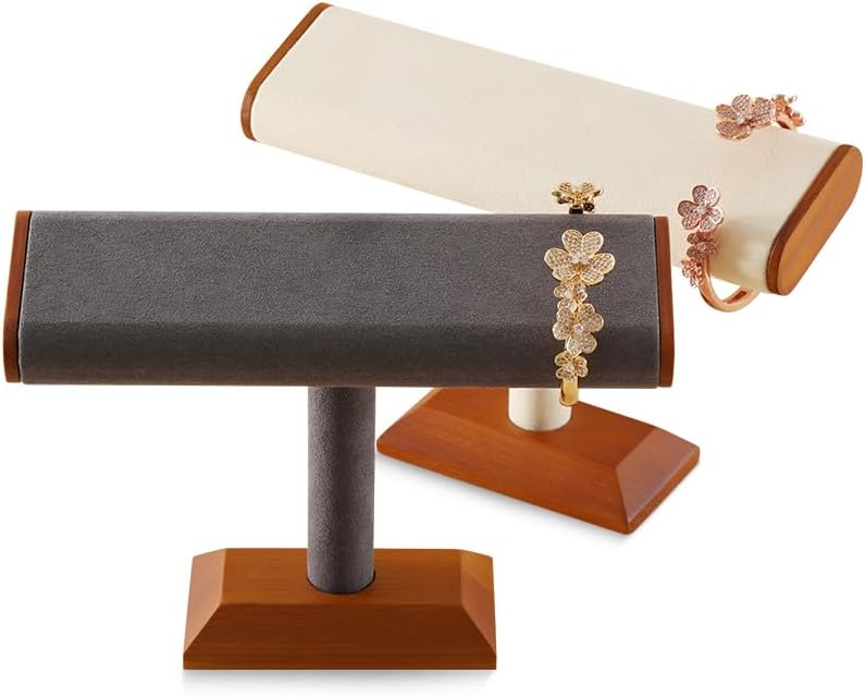 Specification: T-shape Display Stand Color: beige&gray Material: solid wood+microfiber The weight and size are as shown Features: 🎉PREMIUM QUALITY MATERIAL: This display stand is made of sturdy solid wood material to ensure product stability and durability for long time use. Comes with a fine and soft microfiber jewelry display stand that gently cradles the bracelets and watches at the best display angle. 🎉T-SHAPE DESIGN: The display rack features a T-shape design to allow bracelets and watches to be hung and displayed evenly, creating a symmetrical aesthetic. 🎉MULTIPLE STYLES AVAILABLE: Three different styles of T-shaped racks are available, you can choose the one that best suits the decorative style of your jewelry store or store according to your needs. 🎉Strong compatibility: the display rack is suitable for all kinds of bracelets and watches, no matter it is a watch chain of different thickness or a variety of wrist jewelry, it can be perfectly matched with the display. 🎉ORGANIZATIONAL FUNCTION: In addition to displaying, this display can be used to organize and tidy up bracelets and watches, ensuring that they are stored in an orderly manner and easily accessible. Package: 1 Piece T-shape Display Stand, Jewelry Not Included Tray