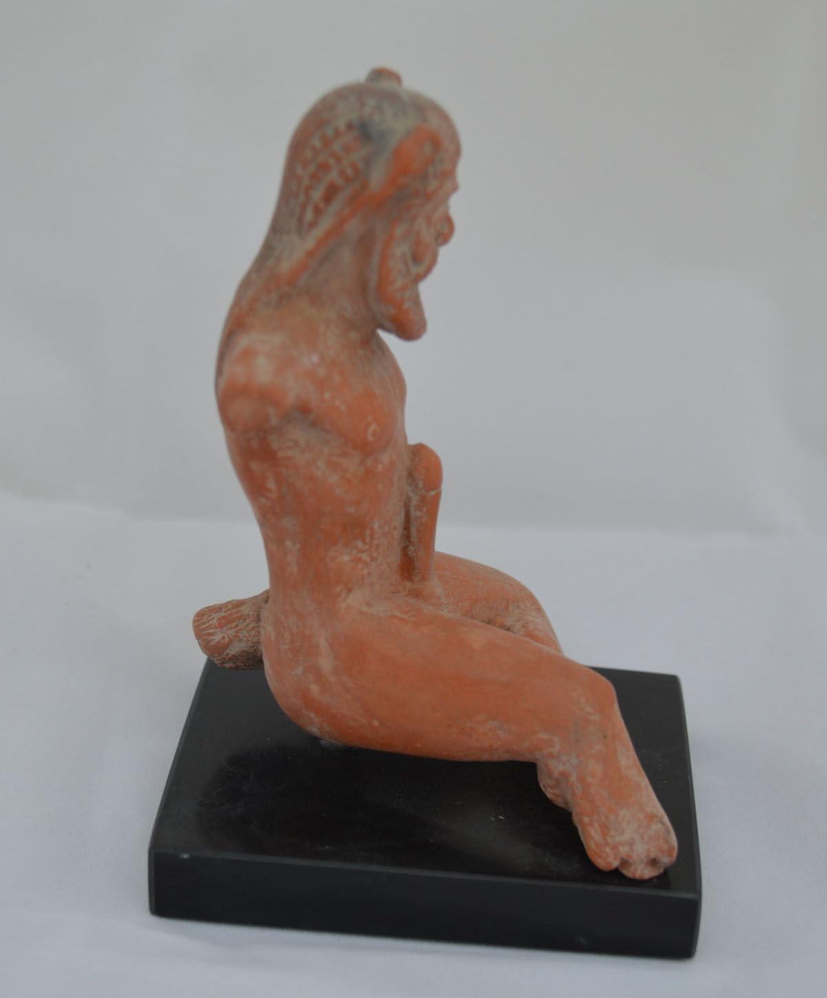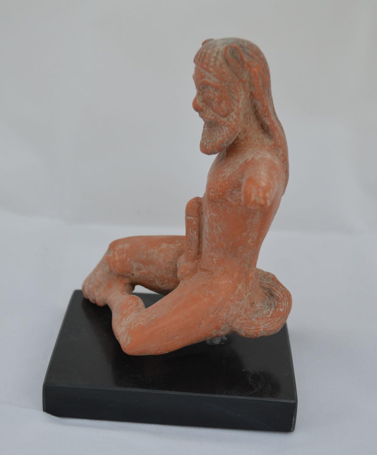 In Greek mythology, a satyr is one of a troop of male companions of Pan and Dionysus with goat-like (caprine) features, including a goat-tail, goat-like ears, and sometimes a goat-like phallus. In Roman Mythology there is a similar concept with goat-like features, the faun being half-man, half-goat. Greek-speaking Romans often used the Greek term saturos when referring to the Latin faunus, and eventually syncretized the two. The female "Satyresses" were a late invention of poets - that roamed the woods and mountains. In myths they are often associated with pipe-playing. The satyrs' chief was Silenus, a minor deity associated (like Hermes and Priapus) with fertility. These characters can be found in the only complete remaining satyr play, Cyclops, by Euripides, and the fragments of Sophocles' Ichneutae (Tracking Satyrs). The satyr play was a short, lighthearted tailpiece performed after each trilogy of tragedies in Athenian festivals honoring Dionysus. There is not enough evidence to determine whether the satyr play regularly drew on the same myths as those dramatized in the tragedies that preceded. It was made in Greece, stands 6.5 cm width, 13 cm high and weighs approximately 420 g. Details: Condition: New, Handmade in Greece. Material: Ceramic Height: 13cm (5.1") Width: 6.5cm (2.5") Weight: 420g