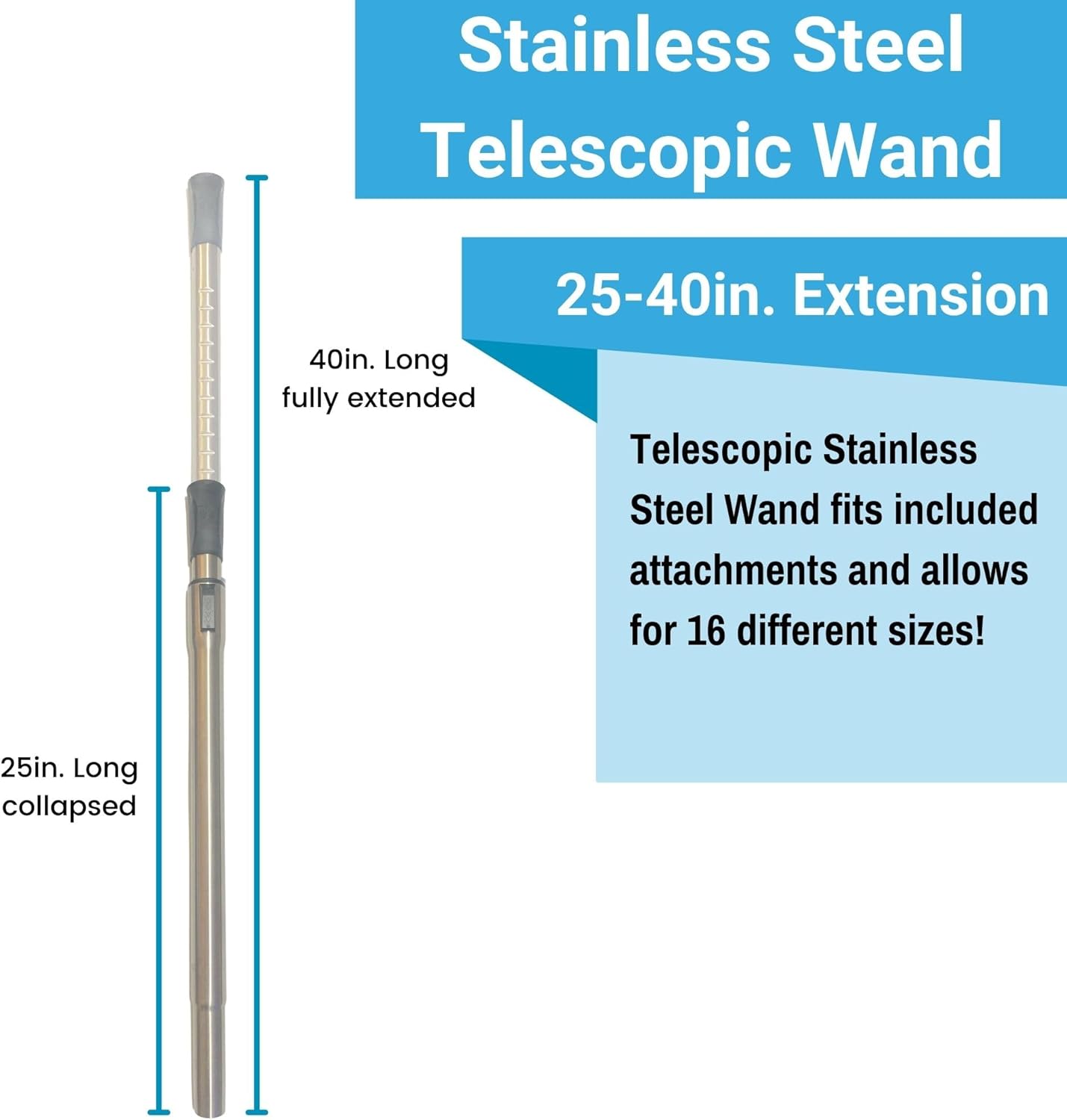 Looking for a versatile replacement wand for your vacuum cleaner attachments? This Stainless Steel Extension Wand is the perfect tool for a variety of cleaning tasks. It fits 1 1/4 in. (32mm) friction fit and button lock vacuum accessories and attachments, making it a versatile central vacuum wand replacement for any cleaning situation. The height adjustment racket makes it easy to adjust the wand to the perfect height, while the telescoping tube allows for 16 different lengths to accommodate any cleaning situation. The telescoping tube has a collapsed length of 25 inches with a fully extended length of 40 inches long. Pair this central vacuum extension wand with any of our 1.25 inch (32mm) Wessel-Werk central vacuum attachments to experience the best floor cleaning experience. Compatible with major brands of canister and central vacuum accessories, making it a great replacement vacuum wand for Beam, VacuFlo, Hayden, CenTec, MD Manufacturing, Oreck, and nutone central vacuum accessories. Vacuum wand attachment is a great replacement extension wand for Sanitaire Mighty Style vacuums model series vacuums: 3670, 3672, 3674. 3676, 3682, 3685, 3680 and SC3683A and eureka vacuum accessories.